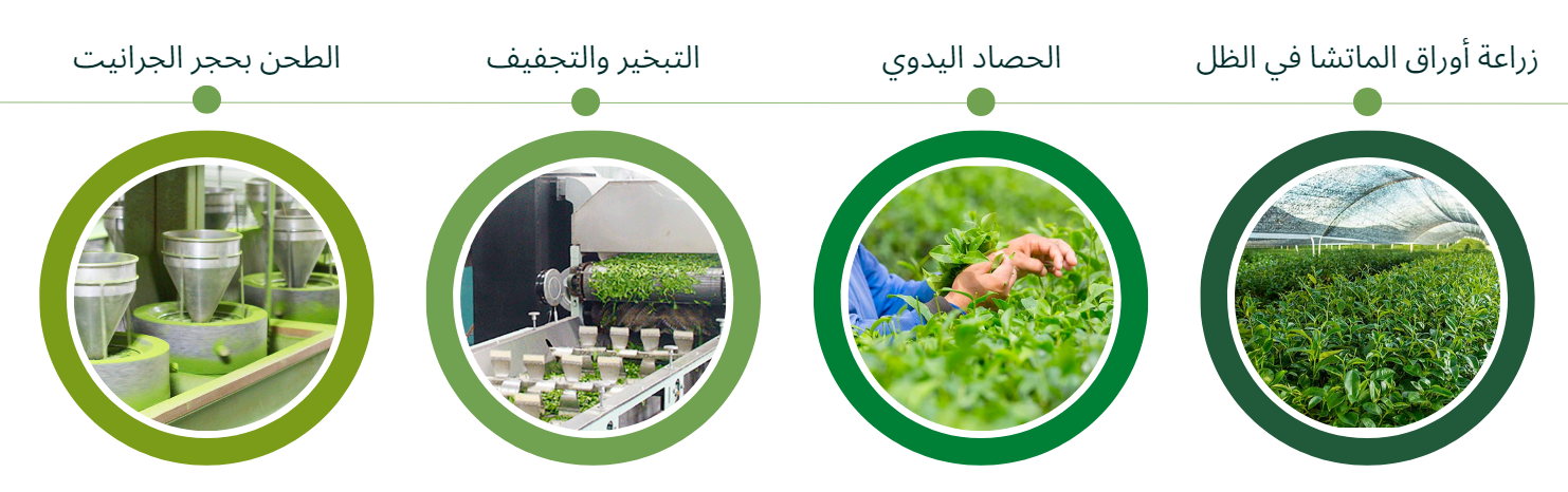 قبل الحصاد بحوالي 3-4 أسابيع، تُغطى نباتات الشاي لحجب ضوء الشمس. هذا يزيد من إنتاج الكلوروفيل في الأوراق، مما يجعلها أكثر خضارًا ويزيد من تركيز بعض المركبات مثل الأحماض الأمينية. بعد الحصاد، تُبخر الأوراق وتجفف، ثم تُطحن إلى مسحوق ناعم جدًا باستخدام أحجار الجرانيت خاصة.
